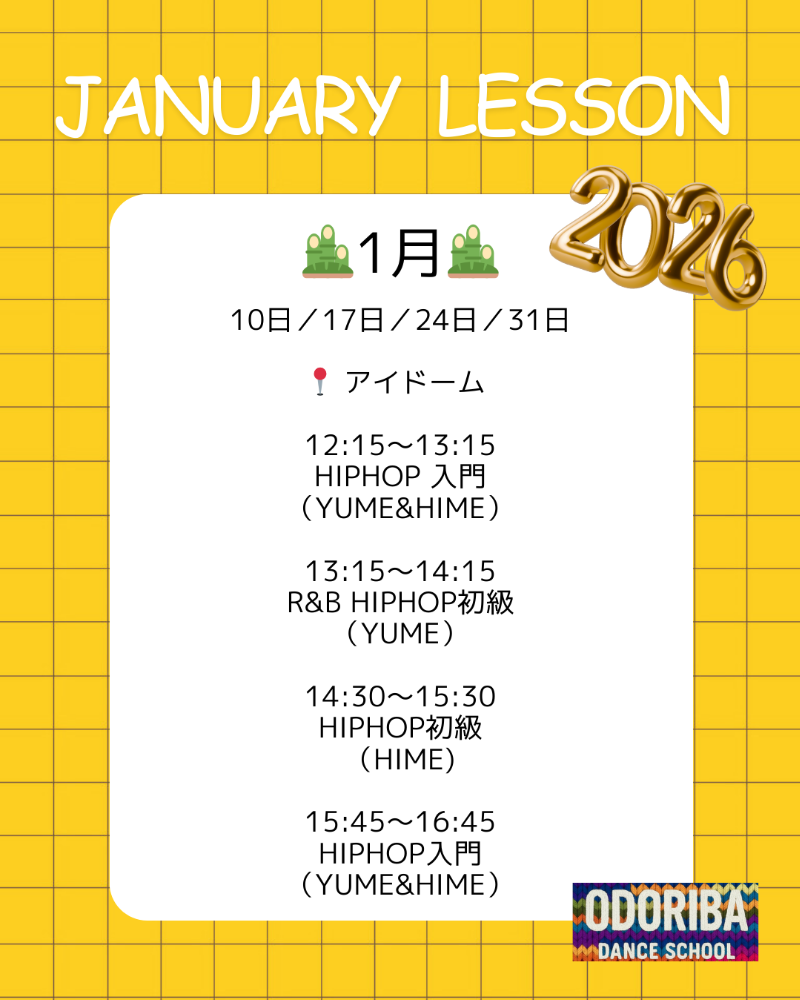 | 12:15 〜 13:15 | HIP HOP入門🔰 ( YUME&HIME ) ※年少〜小学6年生 |