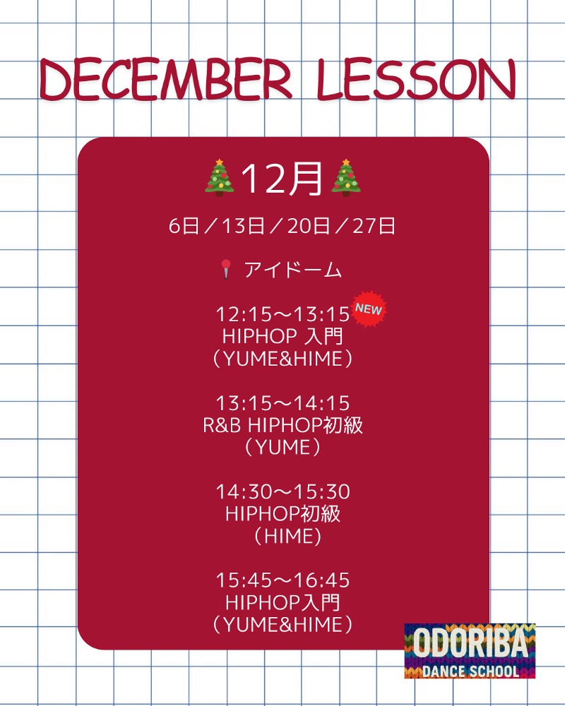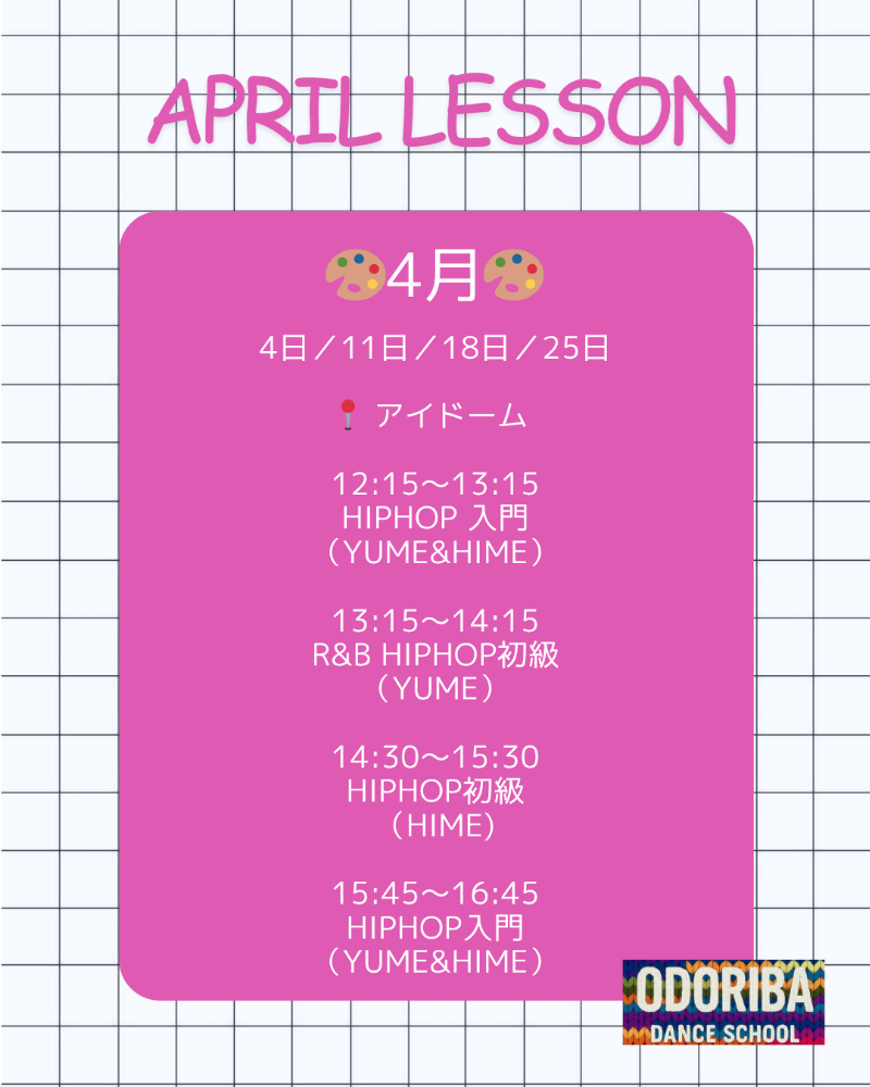 | 12:15 〜 13:15 | HIP HOP入門🔰 ( YUME&HIME ) ※年少〜小学6年生 |
